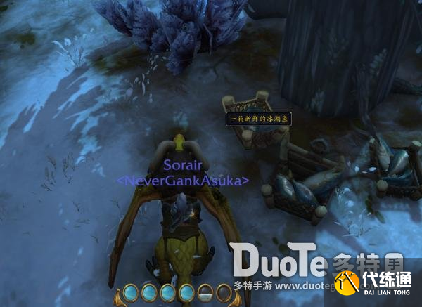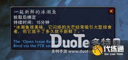 一箱新鲜的冰湖鱼持续时间为15分钟,我们必须在持续时间内尽快飞回索德拉苏斯巨壳可汗身边,将一箱新鲜的冰湖鱼交给耐心的瓦尔戈。