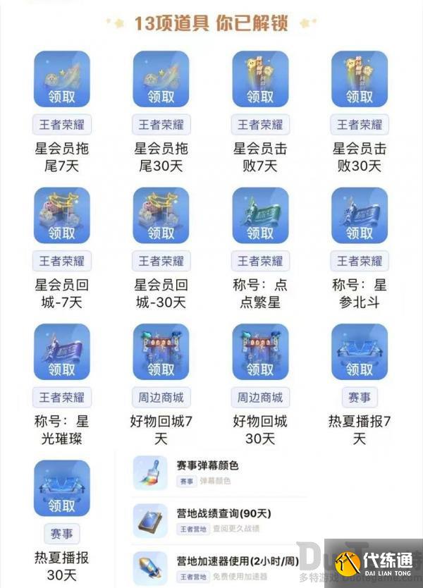13级:营地加速器5小时/周、永久星会员回城
