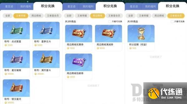 除了星会员等级外,在获得成就的时候,还能得到积分,可在积分兑换商城里面兑换道具,有称号、优惠券、满减券、包邮券、积分延期权益,具体兑换如下图所示: