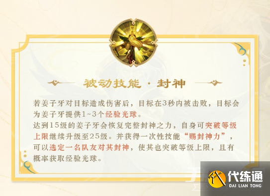 达到15级的姜子牙会恢复完整封神之力,自身可突破等级上限继续升级至25级。并获得一次性技能“赐封神力”可以选定一名队友对其封神,使其也突破等级上限,且有概率获取经验光球。