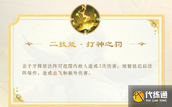 姜子牙释放法阵对范围内敌人造成3次伤害,短暂延迟后法阵爆炸,造成击飞和额外伤害。