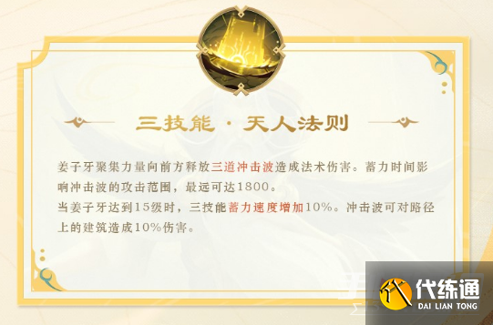 当姜子牙达到15级的时候,三技能蓄力速度增加10%。冲击波可对路径上的建筑造成10%的伤害。