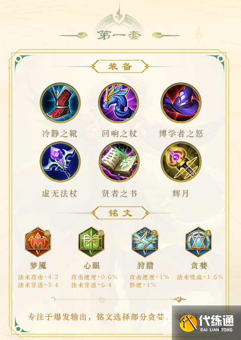第一套:专注于爆发输出,铭文选择部分贪梦,维持续航。