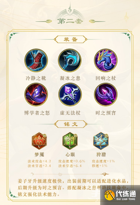 姜子牙升级速度极快,出装前期可以适配进化水晶,后期升级为时之预言。搭配凝冰之息帮助技能命中。铭文强化法术能力