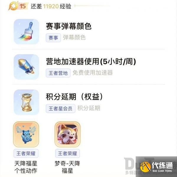 15级:赛事弹幕颜色、营地加速器5小时/周、积分延期(权益)、梦奇永久皮肤天降福星,天降福星个性动作