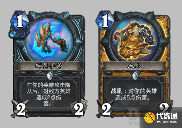 在之前的新卡里预览了一张定向检索武器的符文熔铸,当时还只有霜之哀伤一把武器,这次一次性就放出了三把。碎骨手斧是一把1费的前期武器,血爪又一次被完爆了,不过碎骨手斧这把武器更像恶魔猎手的恐惧牢笼战刃,解场的同时还能打脸,偏快攻的卡组前期用来控场相当不错。