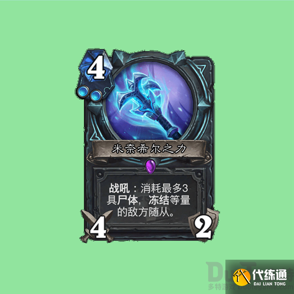 米奈希尔之力的模型非常的标准,4费4/2武器放在现在也不算落后,战吼还能够冻结敌方随从,看起来思路像是把对手随从冻住然后打脸,感觉依然是快攻思路的武器。配合符文熔铸减费可以变成3费的武器,但是效果需要尸体,如果想要触发最大化效果的话可能不会3费准时提起刀。