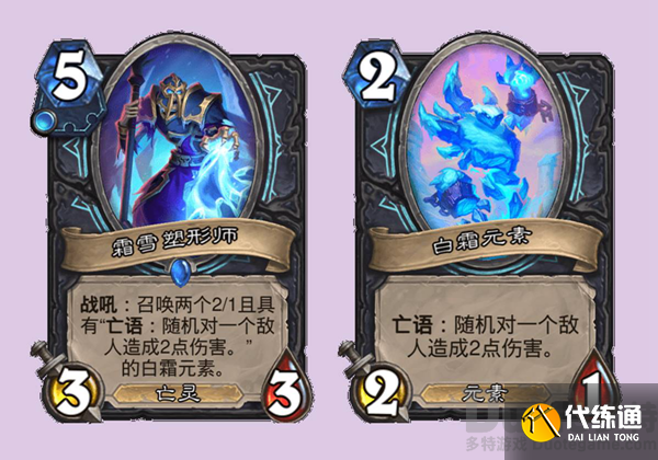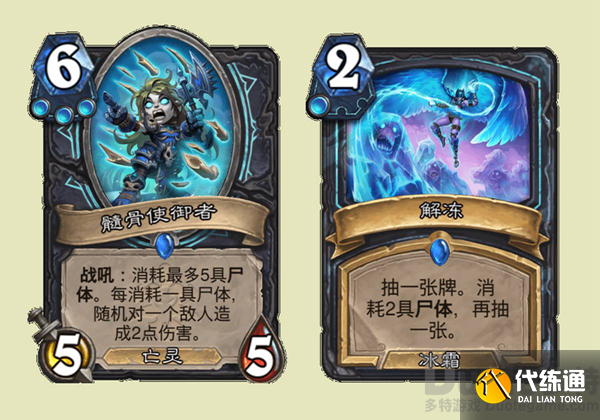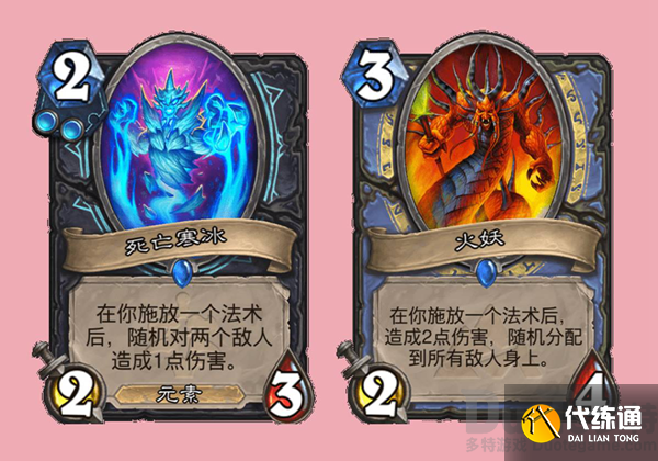 而霜牙之剑减费的法术还可以配合死亡寒冰,这张牌的效果乍一看非常像火妖,不知道登场台词是不是“我侍奉巫妖王”,但细看还是有区别的,死亡寒冰的效果是随机对两个敌人造成1点伤害,就是说如果对方空场的话,每次也只能对脸造成1点伤害,看起来是为了防止冰DK像火妖法一样具有较高斩杀能力而进行的限制。