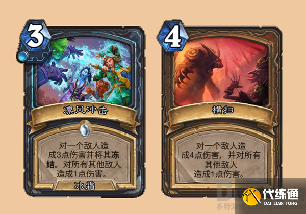 接下来就来看看冰DK的冰霜法术吧,首先是凛风冲击,乍一看那是相当眼熟:这不就是横扫吗,费用减少的同时主要伤害也减少了,但多了一个冻结的效果。不过其实魔兽世界里凛风冲击的技能效果就是这个样子,所以这波炒冷饭也不能完全算炉石设计师的锅。这张卡整体来看要比横扫更灵活,而且多的冻结效果有时候也很关键。
