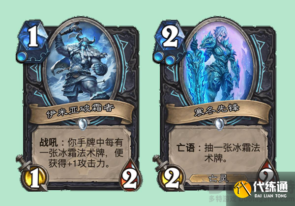 除了冰霜法术,冰DK还有一些配合冰霜法术的随从,比如伊米亚破霜者可以制造一个攻击力很高的随从,在纯色冰DK或者两冰DK卡组里应该会比较好用,因为带有冰霜符文的都是冰霜法术,而寒冬先锋则是定向过牌,不过看起来冰DK卡组里过牌还是蛮多的,不清楚这张卡携带的必要性高不高。