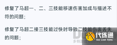 王者荣耀在11月10日发布了一则更新公告,其中在修复内容介绍中写到修复马超技能移速伤害与加成描述不符等条目