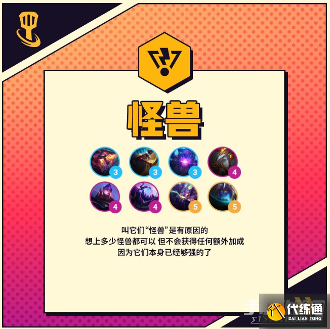 怪兽羁绊算是一个不完全算羁绊的羁绊,弈子不会有别的羁绊效果,而且他们不会因为队里其他反而获得增益。作为补充,所有的弈子会异常强大。