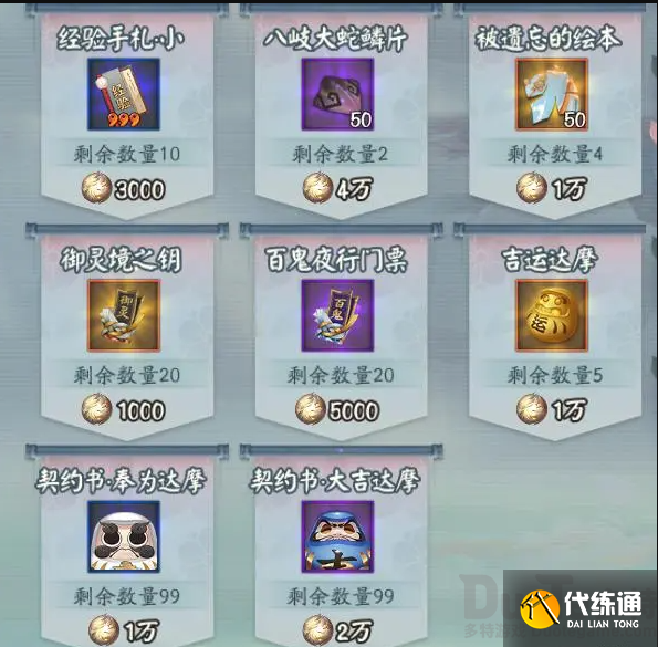 具体的商店资源方面包括白蛋+蓝蛋x99、三星白蛋x1、紫蛇皮x100、金达摩x5、百鬼票x20、御灵钥匙x20、遗忘绘本x200、小经验书x10、四星青吉鬼御魂x10、樱饼x100、体力x2500、金币x1000W、勾玉x50