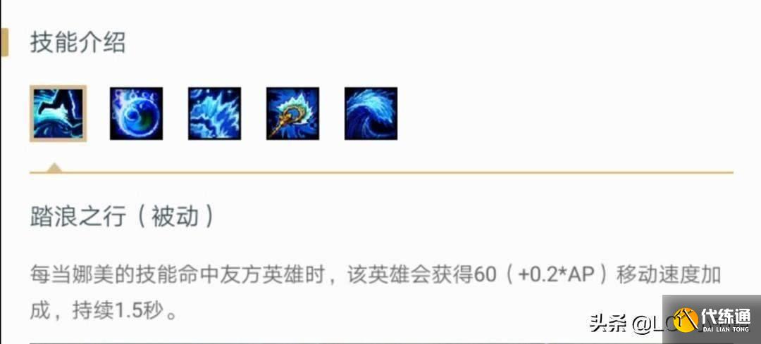 娜美增加友军移速的能力来源于自己的被动技能。娜美的所有技能在命中友军之后,都能够为友军提供移动速度加成!难能可贵的是,这个移速的加成,还能够享受到娜美自身0.2的AP加成。