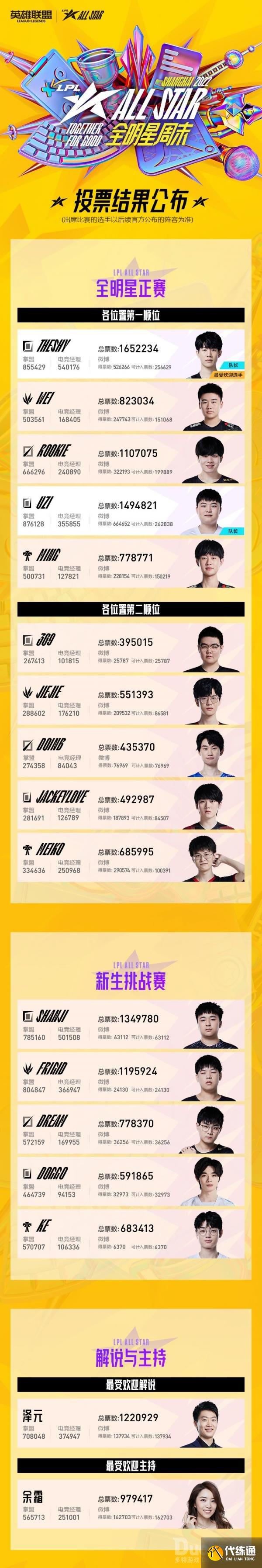 2022LPL全明星周末投票已于11月23日14点正式结束,年度最受欢迎选手、最受欢迎主持、最受欢迎解说及各赛事第一顺位、第二顺位选手现已揭晓。以下为结果详情: