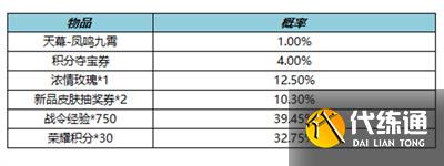 购买红蓝对决(1日),可额外随机获得以下之一:个性天幕-凤鸣九霄(开启125次以内必得)、积分夺宝抵用券、浓情玫瑰*1、新品皮肤抽奖券*2、战令经验*750、荣耀积分*30
