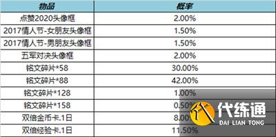 打开后可随机获得以下奖励之一:点赞2020头像框、2017情人节-女朋友头像框、2017情人节-男朋友头像框、五军对决头像框、双倍金币卡:1日、双倍经验卡:1日、铭文碎片*158/128/88/58。