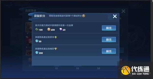 1、在单英雄获取测试积分的任务条件中,“首次完成一局能力测试并且取得胜利” 调整为 ”首次在能力测试中获得胜利或者一次金牌“
