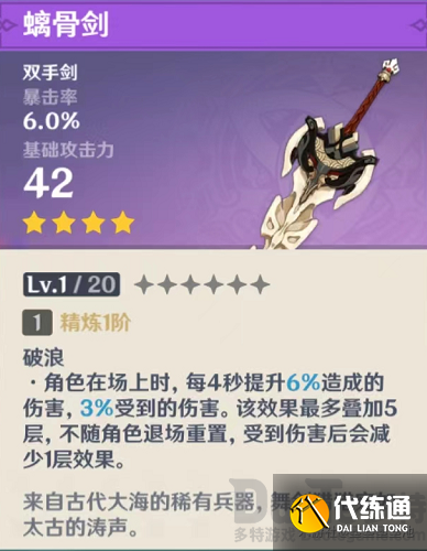 尴尬的是敌人必须至少2个才可触发武器效果,而且攻击拐是最容易获得的,如班尼特Q,讨龙等。相比起上面仨,这哥们就显得有些鸡肋。加上稻妻还有一把四星真神【渔获】免费获得,综合比较之下,也就在第四吧。