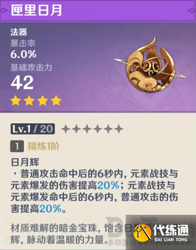 赌狗不出谁与争锋?匣里日月泛用性也是非常非常高的,法器主副c都可以选择,高贵的双暴词条能大大缓解圣遗物压力,武器效果能全面提升元素爆发,元素战技和普攻伤害,精5达到40%的增幅额度,触发机制也非常简单,相较于四风原典苛刻的触发需求,匣里日月真的物超所值!