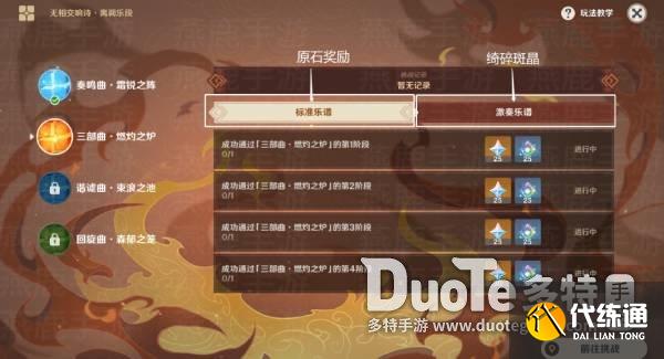 2、这关是[三部曲·燃灼之炉]。拿原石只需要打过标准乐谱就好了。