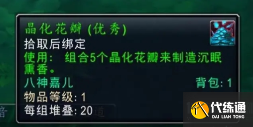 在欧恩哈拉平原的翡翠花园地区可见到少量水晶花与之相互作用可得到晶化花瓣。5枚晶化花瓣可结合成沉眠熏香的效果。