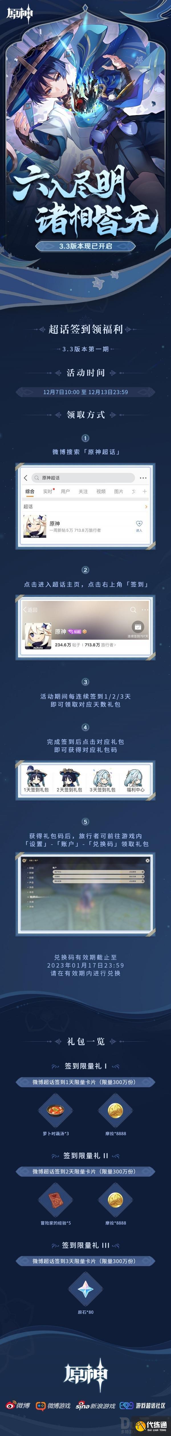 活动期间,在原神超话 内连续签到1/2/3天,即可领取并在游戏内兑换对应天数礼包。