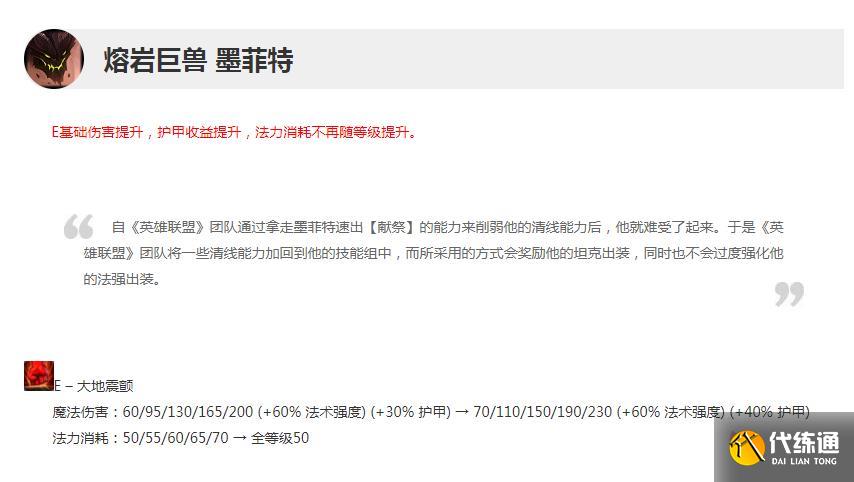 E基础伤害提升,护甲收益提升,法力消耗不再随等级提升。