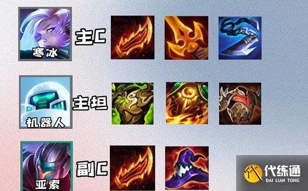 寒冰、鳄鱼、机器人、亚索、卡蜜尔、VN,6人口即可成型。