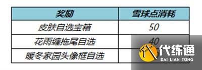 活动奖励:皮肤自选宝箱*1、花雨缠拖尾特效宝箱*1,暖冬家园头像框宝箱*1
