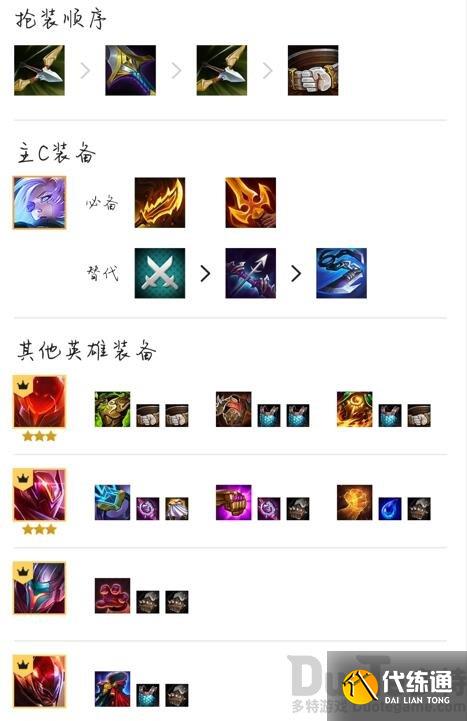 主C艾希最佳装备为羊刀、卢安娜的飓风、锐利之刃,必备羊刀。石头人带肉装,亚索和船长带剩余的物理装。