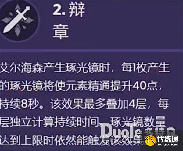 2:二命是根据琢光镜的数量,每一枚产生的琢光镜会让元素精通提升四十点,持续八秒,这个效果最多叠加四层,每层独立计算持续时间,当你的琢光镜达到上限的时候还是可以触发这个效果的;
