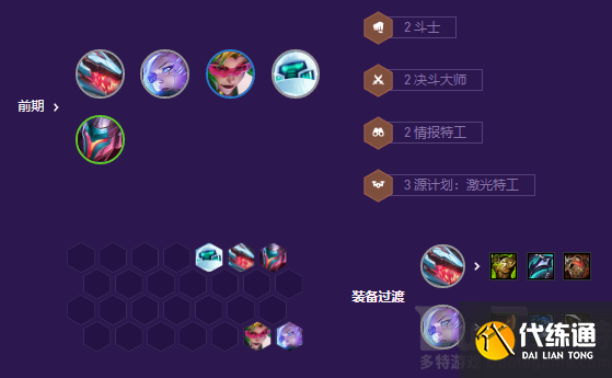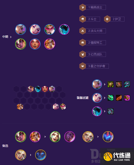 过渡的话,用前排的双护卫/斗士搭后排的决斗/情报/源计划都可以。护卫+小天才也可以。过渡永远是前排+后排,多拿2星质量多留能C或能抗的对子牌。尽全力打连胜过渡,运营到7人口先大D2星,慢慢赌3星。切忌别卖血,特别是不熟悉新赛季的兄弟,需要打连胜节奏,需要容错。