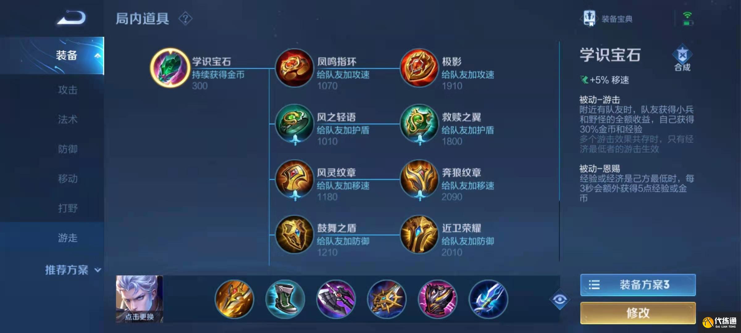 辅助自然不能跟射手抢经济,所欲辅助必须出的就是工资装,先是学识宝石,后来升级为极影,救赎之翼,奔狼徽章或是近卫荣耀等,被动效果恩赐可以带来不小的经济收入。还有就是辅助要看清各路兵线的位置,一旦出现线上没人的情况,就要果断上去吃兵,毕竟被防御塔击杀就浪费了,辅助不抢经济,但是也不能浪费经济对吧。