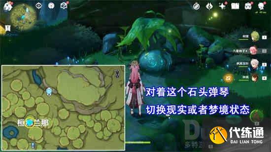 如果是找不到兰随尼,那是你切换到现实状态了,需要进入梦境才能看见,来到桓那兰那中心这里,对着这个石头弹琴切换梦境状态,梦境和现实都是来到这里切换。