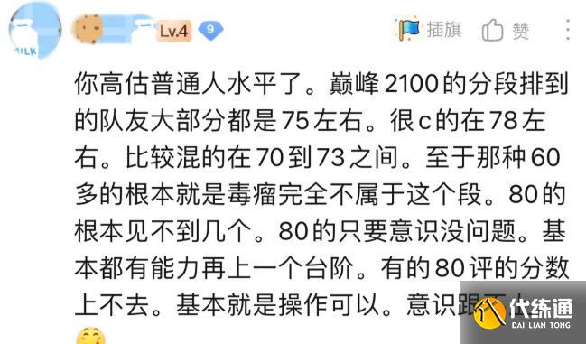 就拿一位巅峰2100分以上的玩家的亲身经历来说,排到的队友大多都只有75分左右,但是巅峰2100那是妥妥的高端局。都是大神。持有这一观点的群众们,则建议该玩家多打几个号,多在几个段位综合看看,会发现75以上的评分并没有随手拈来那么简单!
