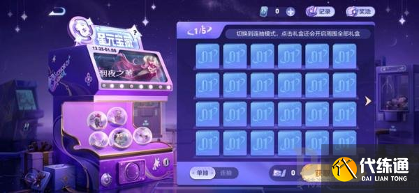 5、抽奖模式说明:点击活动主界面左下角的抽奖模式切换按键,即可在单抽模式和连抽模式进行切换;单抽模式下,点击任意未开启的星元宝藏礼盒,即开启该礼盒,消耗1个星元宝藏礼盒兑换券,获得礼盒中的奖励;连抽模式下,点击任意未开启的星元宝藏礼盒,即开启以其为中心3*3范围内所有未开启的礼盒,消耗开启礼盒数量的星元宝藏礼盒兑换券,若星元宝藏礼盒兑换券数量不足,则会按从左上到右下的次序开启礼盒,直至星元宝藏礼盒兑换券消耗完毕;