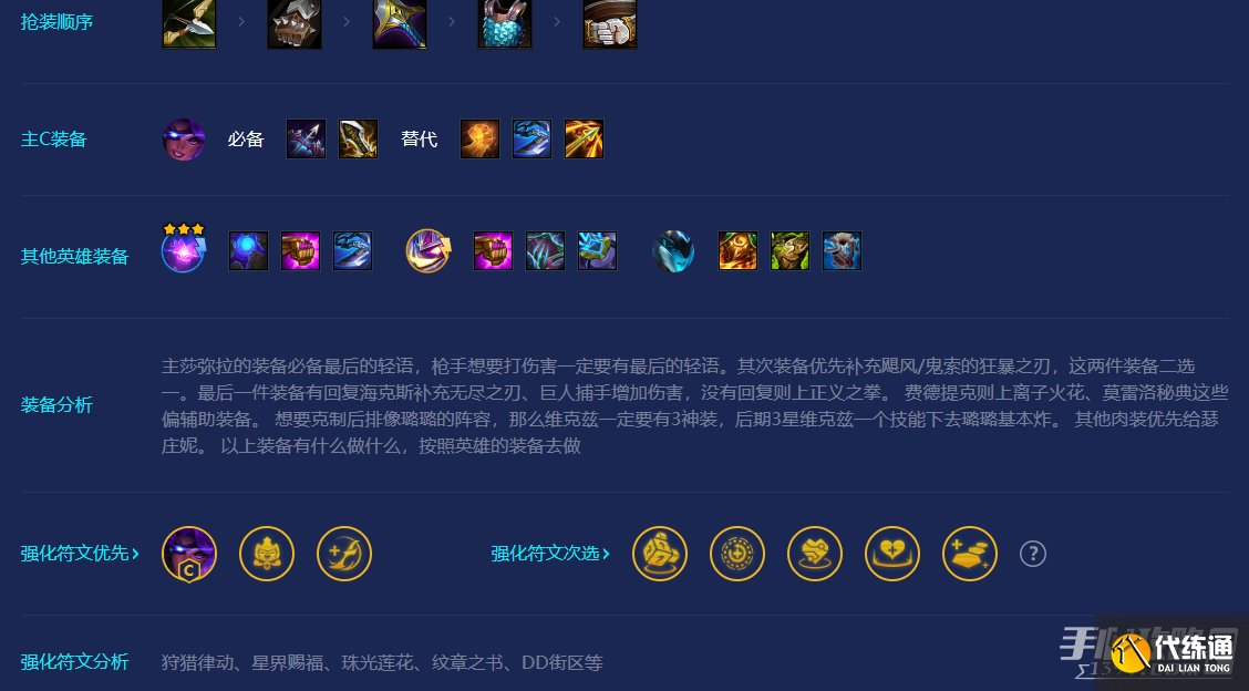费德提克则上离子火花、莫雷洛秘典这些偏辅助装备。 想要克制后排像璐璐的阵容,那么维克兹一定要有3神装,后期3星维克兹一个技能下去璐璐基本炸。 其他肉装优先给瑟庄妮。