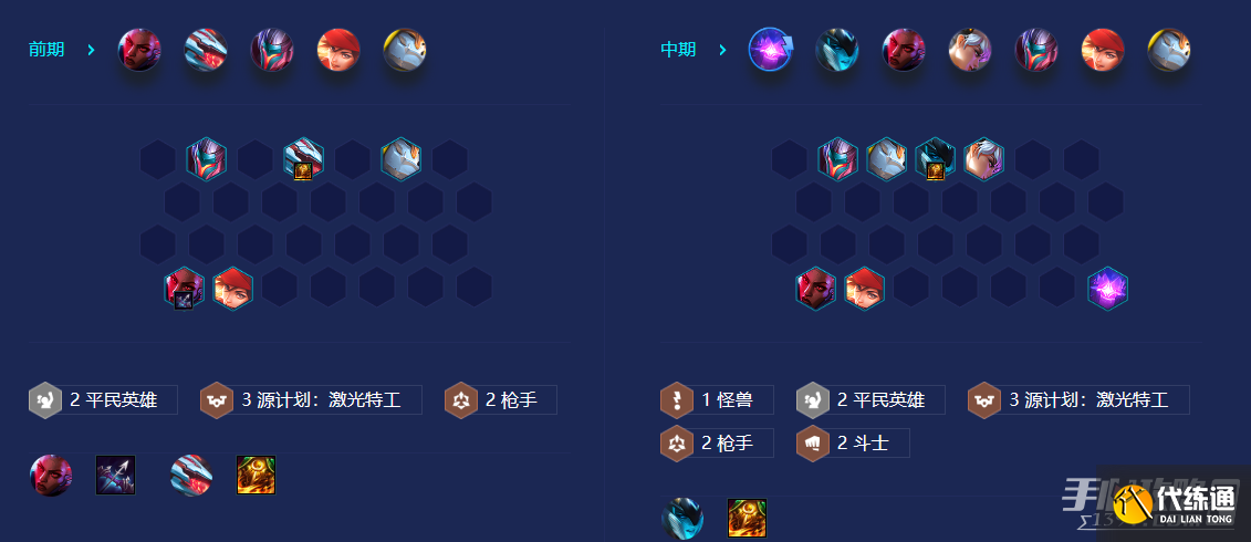 这是一套运营阵容,当前版本运营阵容基本没有任何的公式可言,小嗨只能给大家提供的是一个思路。 阵容前期可以有源计划+2平民英雄过渡,前期先用3源计划2斗士,装备给艾希打工,有赛娜直接开2枪手羁绊过渡,中后期替换高费卡即可。