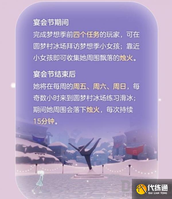 3、小女孩会在每周五、周六、周日的奇数小时在圆梦村滑冰场出现,宴会节结束后玩家也可以按照时间前来寻找,每次出现15分钟为大家带来烛火;