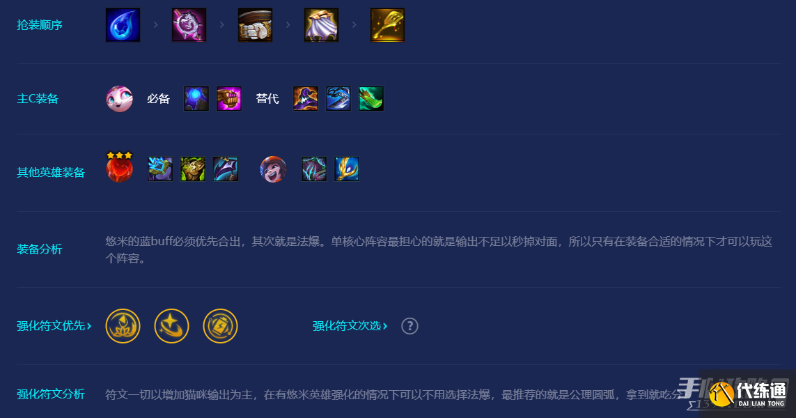 悠米的蓝buff必须优先合出,其次就是法爆。单核心阵容最担心的就是输出不足以秒掉对面,所以只有在装备合适的情况下才可以玩这个阵容。