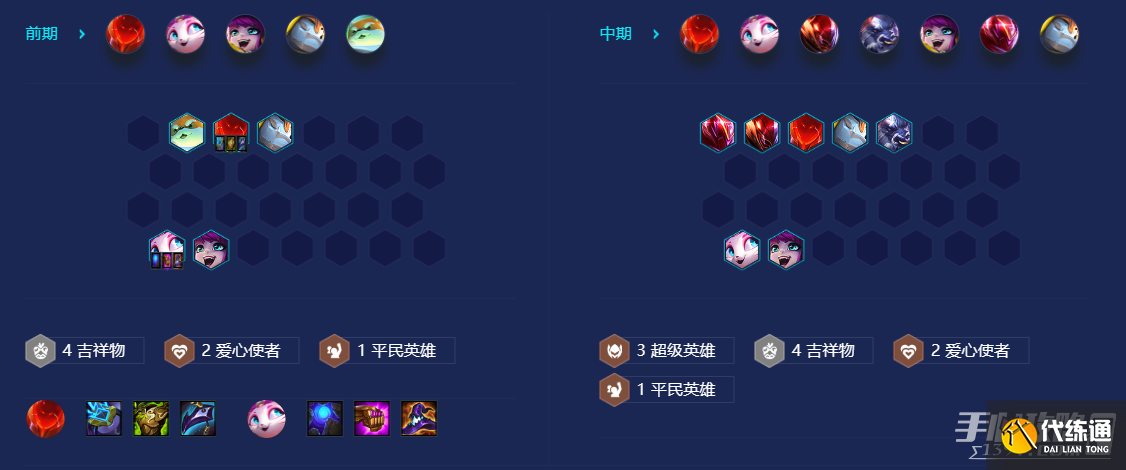 前期凑出四吉祥物、二爱心使者羁绊,可以掉血先拿悠米装备,优先合出蓝buff。 六级D出三星悠米,七级开出三超级英雄四吉祥物二爱心使者,达到强势期。
