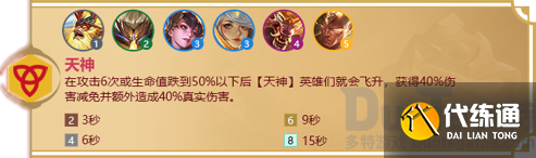 攻击六刺或者生命值低于50%之后,天神会飞升,获得40%伤害减免和额外40%真实伤害。