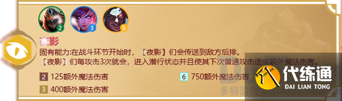 战斗开始时,夜影跳到敌人后排,每3刺攻击会进入潜行状态,下次攻击造成额外伤害。