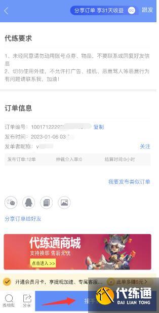在接手了满意的订单之后,根据接单流程操作,接单之后需要冻结代练保证金在平台,交完保证金之后订单内会出现代练账户以及代练密码。(上号后上传首图,账户有任何问题,订单内提交异常,上传异常截图,等待发单者处理之后,再解除异常就好了)