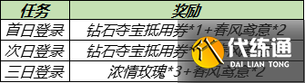 更新后接下来三天里,小伙伴们一共可以获得钻石夺宝抵用券*2+春风鸢意*6+浓情玫瑰*3的奖励。