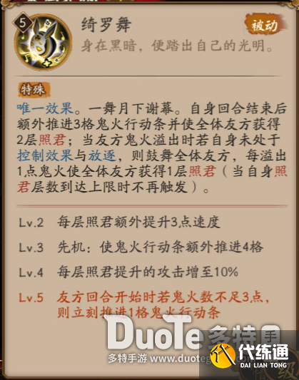 唯一效果。一舞月下谢幕,自身回合结束后额外推进3格鬼火行动条并使全体友方获得2层照君;当友方鬼火溢出时若自身未处于控制效果与放逐,则鼓舞全体友方,每溢出1点鬼火使全体友方获得1层照君(当自身照君层数到达上限时不再触发)。