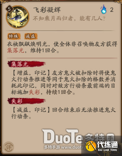 衣袂飘飙焕明光,使全体非召唤物友方获得集落光,维持1回合。