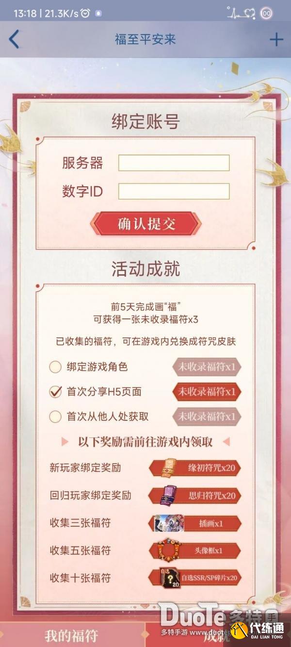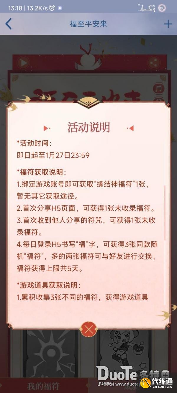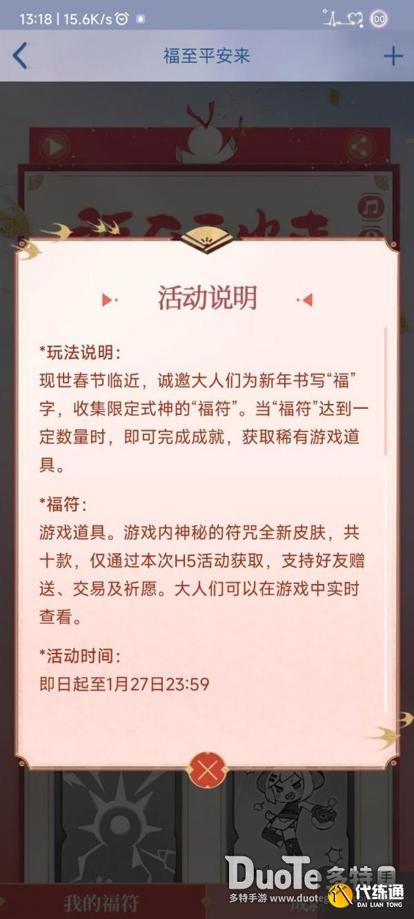 3、福符获取:除缘结神的福符在首次进入活动时即可获得外,大人每天前往H5可直接获得最多5张福符,其余福符可以在H5中与其他人交换获得。