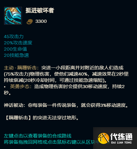 挺进破坏者:这件装备是极大多比较笨重的战士的福音,其提供的极短的技能cd以及附带的小位移效果,再加上减速,可以让手短战士在更短的时间内打出自己想要的连招。并且合成路线的平滑以及铁刺鞭不俗的打钱能力,都让他在上路的对抗中起着决定性的存在。适合的英雄主要有德玛,诺手等。